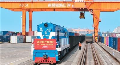 Recently, Jiangxi’s first “Trans-Caspian” CRE train, loaded with marble products, cotton fabrics, wallpaper and other goods, successfully departed from Nanchang International Land Port. The Jiangxi “Trans-Caspian” CRE train exits the country via the Horgos port, crosses the Caspian Sea and arrives in Baku, the capital of Azerbaijan, creating a stable, fast, safe and efficient new freight corridor linking central China with Central Asian countries. The photo shows the train departing from Nanchang International Land Port.