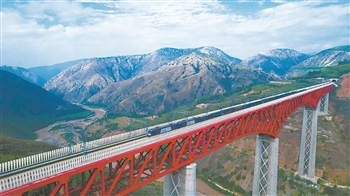 A China-Laos Railway Freight Train Crossing the Yuanjiang Double-Track Bridge