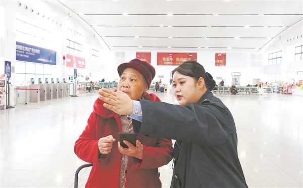 近日,北海站客運員陳佳洋為老年旅客提供乘車引導(dǎo)。吳柯榮 攝