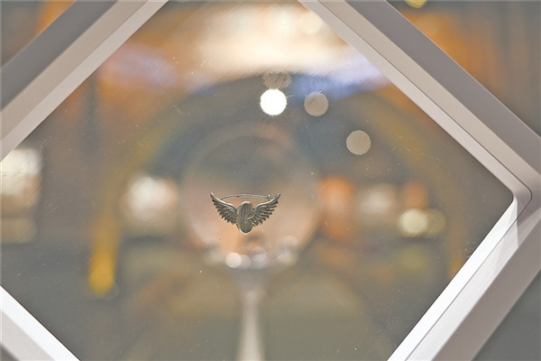 徽章是純銀材質(zhì),寬25毫米,高14毫米,厚1.3毫米,重3克。通過放大鏡可以看到,其正面以一個(gè)直立的機(jī)車動(dòng)輪為主體,兩側(cè)配以飛翼,組成“飛輪”圖案,象征列車在鐵道上飛馳,被形象地稱為“飛輪”徽章。背面刻有“CHINA”(中國)標(biāo)識(shí)及編號(hào)“669”。