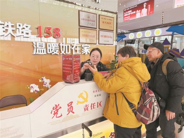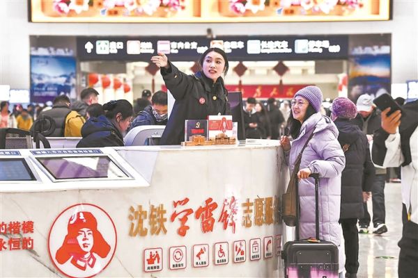 2月28日,沈陽北站學(xué)雷鋒志愿服務(wù)臺工作人員為旅客指路。陳明 攝