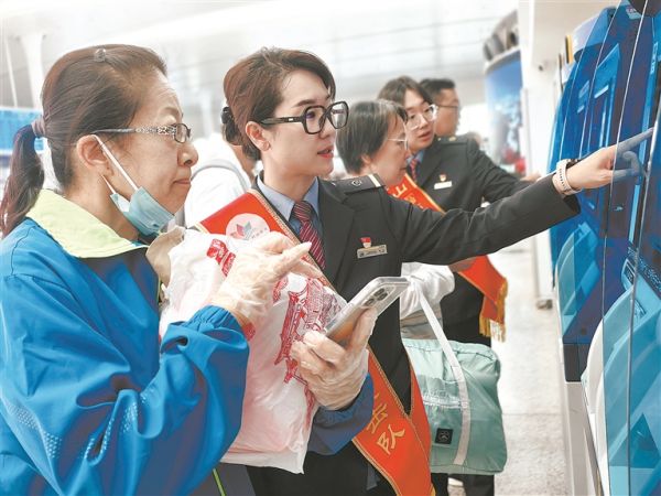 2月28日,烏魯木齊站工作人員在自助售票機(jī)前協(xié)助旅客辦理購票、打印報(bào)銷憑證等業(yè)務(wù)。楊珂 攝
