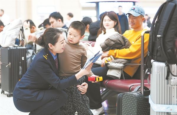 2月27日,哈爾濱站工作人員為小旅客講解出行提示卡。康健 攝