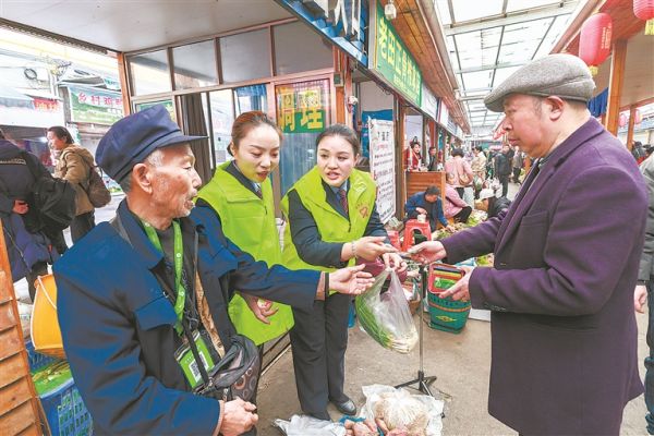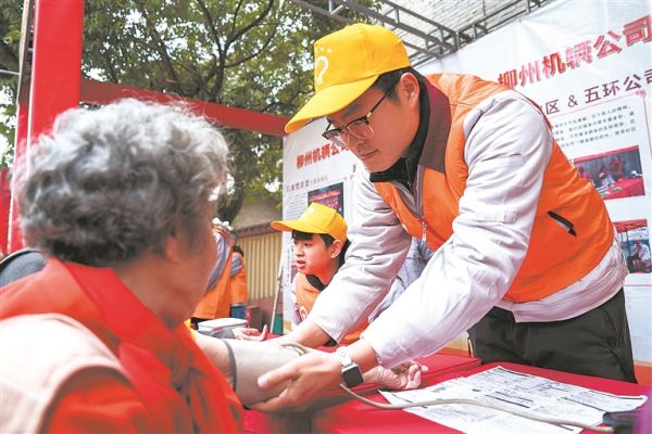 2月25日,柳州機(jī)車車輛有限公司青年志愿者在“雷鋒街市”為市民測量血壓。劉坤 攝