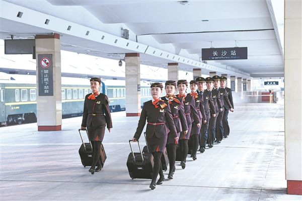 2月25日,長沙客運(yùn)段長京車隊(duì)D2次“雷鋒號”列車乘務(wù)組列隊(duì)出乘。馬鑫 攝