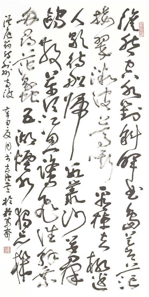 翻開他為此次畫展精心準備的作品集,像翻過他的人生書頁,詩中的歲月猶在,字中的心跡猶在,師友相交的溫暖猶在。筆墨縱橫游走,像一條生命的河流,流經(jīng)不同的時空,帶著歲月的風景,匯聚成波瀾壯闊的江河,向著大海的方向奔騰而去。