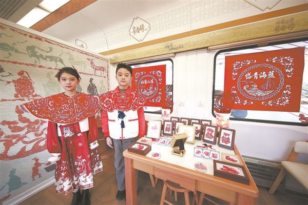 “好客山東·齊魯1號”文物研學(xué)主題旅游列車熱鬧非凡:山東歌舞劇院演員獻唱《上春山》;青銅主題車廂以圖片形式展示各種青銅時代的文物;參與研學(xué)的小旅客展示體驗非遺剪紙作品;各種文物藝術(shù)品集中亮相。