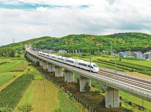 列車行駛在鄭渝高鐵湖北襄陽市東津新區(qū)境內(nèi)。新華社發(fā)