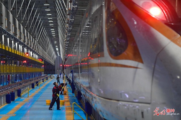 2021年10月5日凌晨,北京朝陽動車所職工對入庫列車實時“洗澡”和“美容”,確保節(jié)日運輸安全。(孫立君攝/光明圖片)