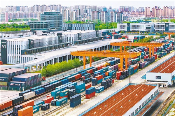 4月8日,位于安徽省合肥廬陽經(jīng)濟(jì)技術(shù)開發(fā)區(qū)的合肥北站物流基地,滿載貨物的中歐班列整裝待發(fā)。當(dāng)?shù)丶涌臁肮罚F路+海運(yùn)”多式聯(lián)運(yùn)綜合物流運(yùn)輸體系建設(shè),今年一季度中歐班列(合肥)共發(fā)運(yùn)126列,同比增長129.1%。趙 明攝(中經(jīng)視覺)