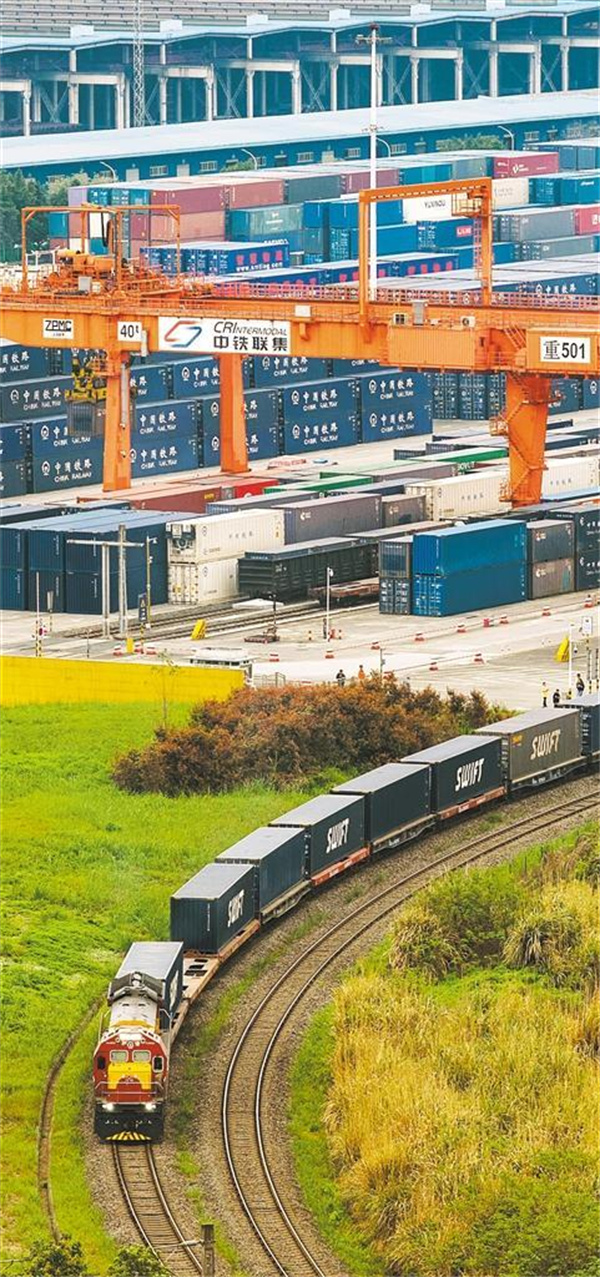 3月27日,重慶市沙坪壩區(qū)鐵路團(tuán)結(jié)村中心站,一列中歐班列(成渝)列車駛出站臺(tái)。孫凱芳攝(中經(jīng)視覺)