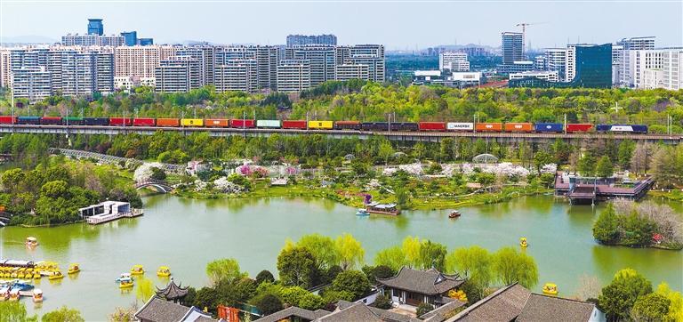 4月4日,一列滿載集裝箱的列車途經(jīng)浙江省寧波鎮(zhèn)海植物園。寧波舟山港積極發(fā)揮海鐵聯(lián)運(yùn)等多式聯(lián)運(yùn)優(yōu)勢(shì),海鐵聯(lián)運(yùn)線路超110條。胡學(xué)軍攝(中經(jīng)視覺)