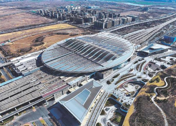 這是京雄城際鐵路雄安站(3月18日攝)。京雄城際鐵路雄安站站頂分布式光伏電站總裝機(jī)容量6000千瓦,站頂鋪設(shè)1.77萬塊、4.2萬平方米多晶硅光伏組件,電站采用自發(fā)自...