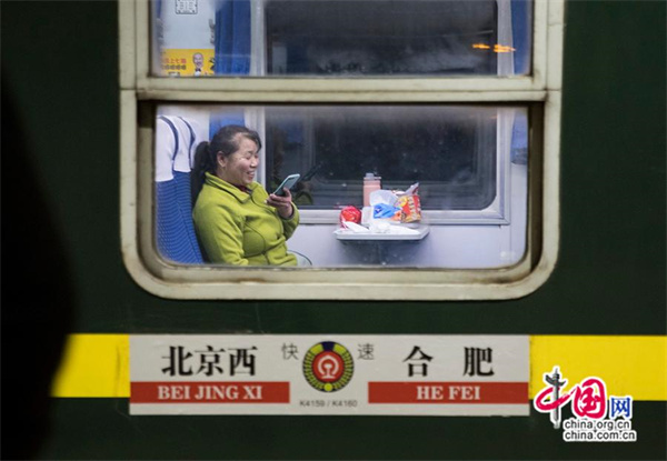 登上K4159次春運(yùn)首班列車的乘客第一時間向家人報平安。中國網(wǎng)記者 馬曠/攝
