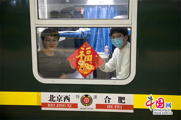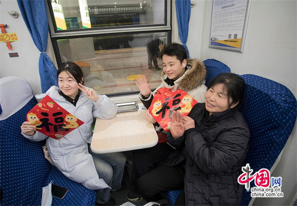 旅客在K4159次列車上展示福字。中國網記者 馬曠/攝