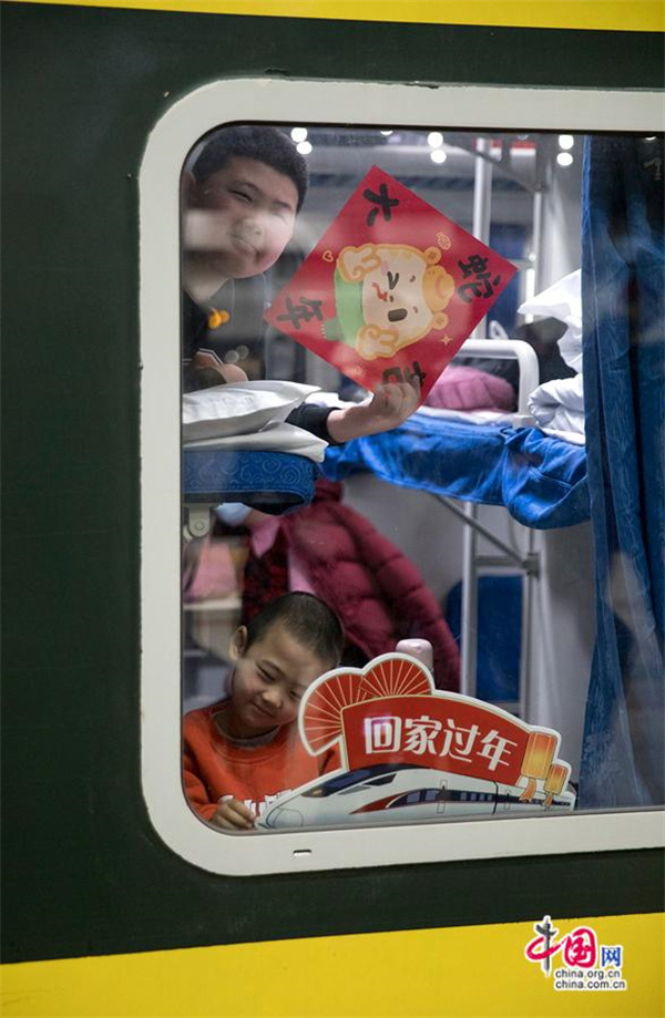 小朋友在車廂窗口期盼年味兒到來。中國網記者 馬曠/攝