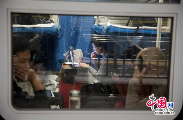 踏上歸鄉(xiāng)的乘客仍不忘處理遺留的“手頭作業(yè)”。中國網記者 馬曠/攝