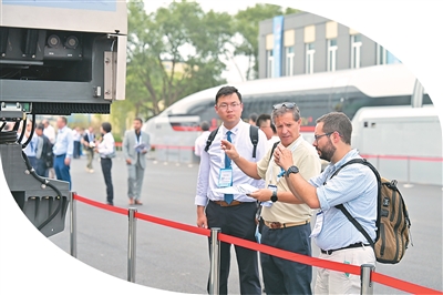 7月9日,第十二屆世界高鐵大會(huì)“高鐵創(chuàng)新之旅”活動(dòng)現(xiàn)場(chǎng),參會(huì)代表在室外實(shí)車展示區(qū)進(jìn)行觀摩。王 瑋攝(人民圖片)